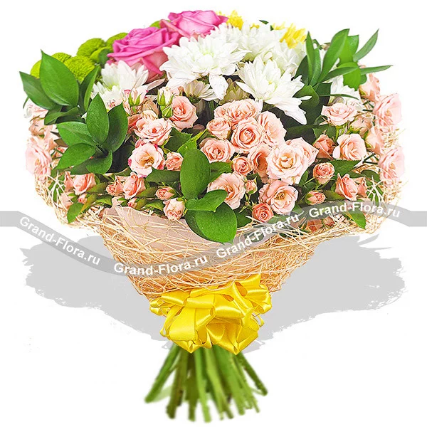 Стандартный (на фото): роза розовая (аква) - 3 шт, роза кустовая розовая - 4 шт, хризантема кустовая белая - 2 шт, хризантема кустовая зеленая(возможна замена на ромашковидную окрашенную) - 1 шт, хризантема одноголовая желтая - 2 шт, рускус, натуральная упаковка, желтый бант.Примерный диаметр букета 30х30 см.