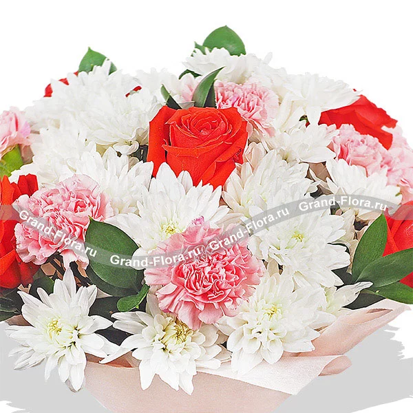 ДЕЛЮКС: роза красная - 15 шт., гвоздика розовая - 16 шт., хризантема кустовая белая - 10 шт., рускус, фетр розовый. Примерный объем букета 40 и более см.Нежнейший букет собран из утонченных кустовых белых хризантем. Выразительности композиции придают огненные красные розы и деликатные розовые гвоздики. Довершает цветочное сочетание рускус и умело подобранная упаковка. Очаровательный букет станет безупречным решением для вручения маме в день ее рождения. Кроме того, столь роскошная композиция поможет пленить сердце девушки, завоевав его навсегда.