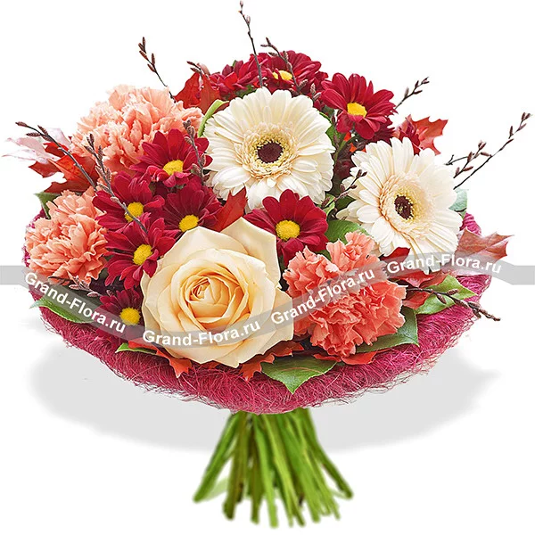 Стандартный: роза кремовая - 3 шт., гербера кремовая - 4 шт., гвоздика розовая - 4 шт., хризантема бордовая кустовая - 4 шт., рускус (салал) - 3 шт., фетр, декор осенние листья.